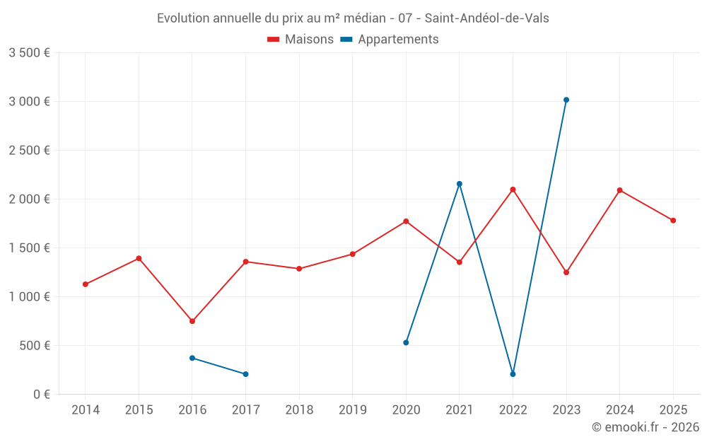 Le prix médian sur les 14 transactions de maisons des 24 derniers mois dans la commune de Saint-Andéol-de-Vals était de 1 908 € par mètre carré pour une valeur foncière médiane de 145 000 €. Sur cette période 60% des transactions se sont situées entre 1 053 et 2 378 € par mètre carré (du 2ème au 8ème déciles).