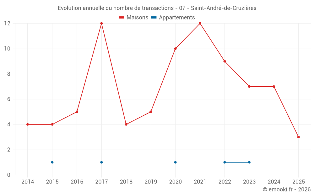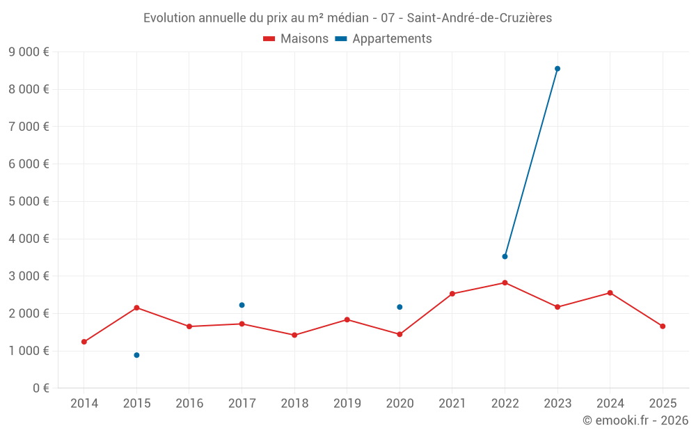Le prix médian sur les 15 transactions de maisons des 24 derniers mois dans la commune de Saint-André-de-Cruzières était de 2 553 € par mètre carré pour une valeur foncière médiane de 239 830 €. Sur cette période 60% des transactions se sont situées entre 1 497 et 2 763 € par mètre carré (du 2ème au 8ème déciles).