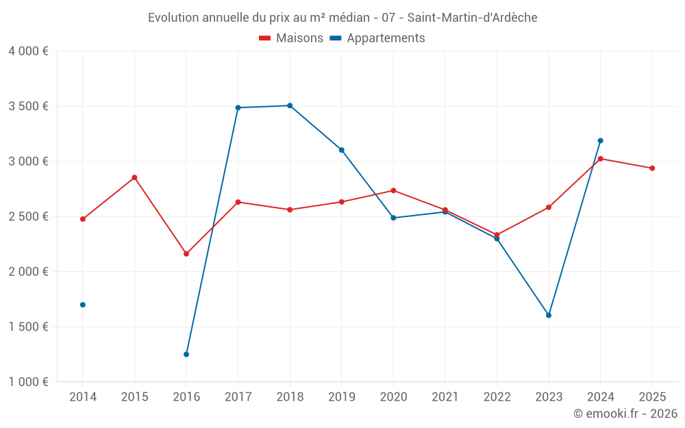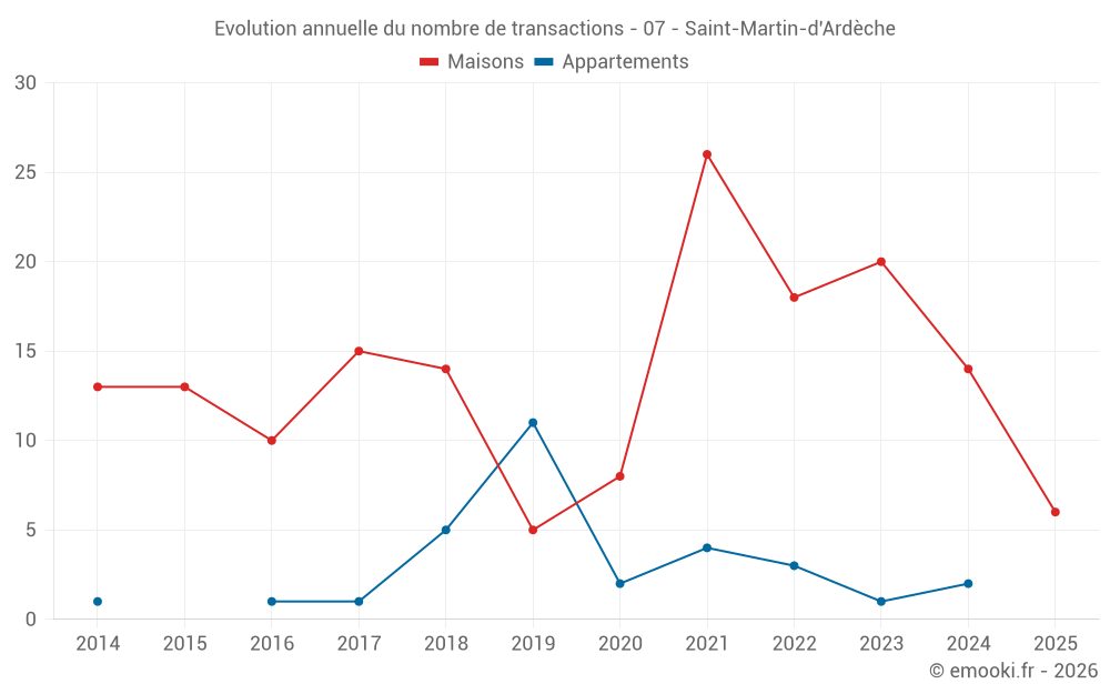 Le prix médian sur les 28 transactions de maisons des 24 derniers mois dans la commune de Saint-Martin-d'Ardèche était de 2 757 € par mètre carré pour une valeur foncière médiane de 182 050 €. Sur cette période 60% des transactions se sont situées entre 1 721 et 3 519 € par mètre carré (du 2ème au 8ème déciles).