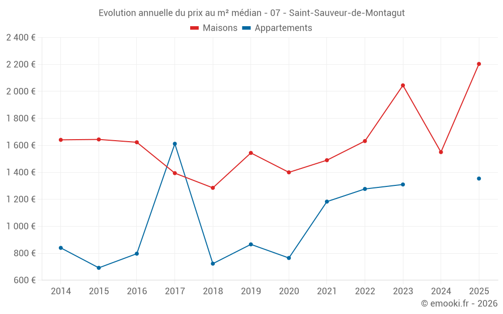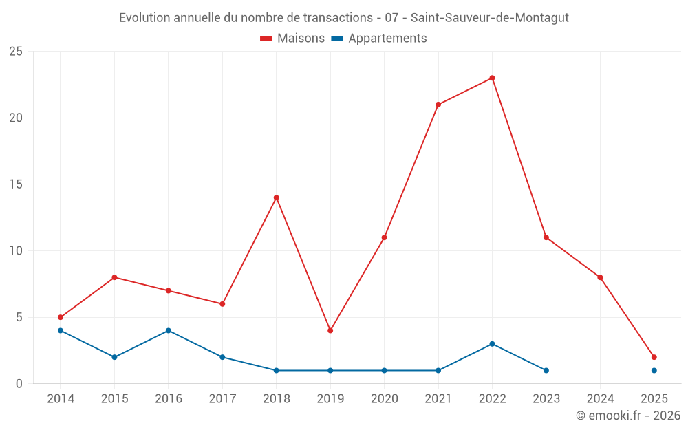 Le prix médian sur les 14 transactions de maisons des 24 derniers mois dans la commune de Saint-Sauveur-de-Montagut était de 1 810 € par mètre carré pour une valeur foncière médiane de 136 250 €. Sur cette période 60% des transactions se sont situées entre 1 139 et 2 189 € par mètre carré (du 2ème au 8ème déciles).