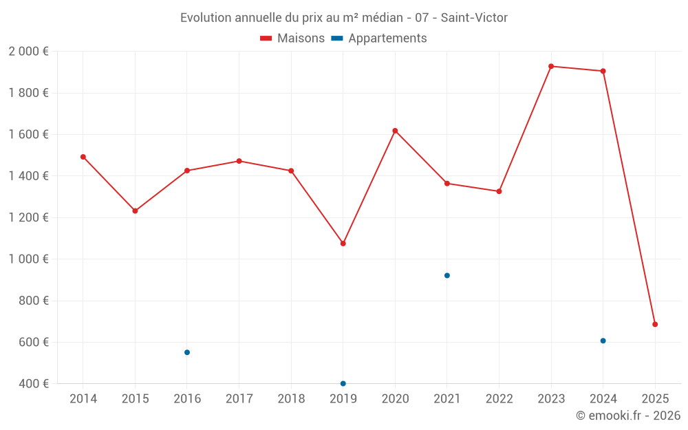 Le prix médian sur les 20 transactions de maisons des 24 derniers mois dans la commune de Saint-Victor était de 1 604 € par mètre carré pour une valeur foncière médiane de 174 000 €. Sur cette période 60% des transactions se sont situées entre 933 et 2 158 € par mètre carré (du 2ème au 8ème déciles).
