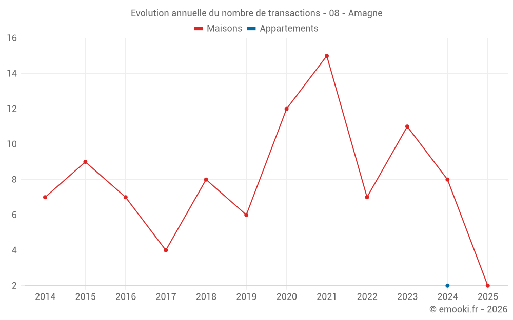 Le prix médian sur les 15 transactions de maisons des 24 derniers mois dans la commune d'Amagne était de 1 267 € par mètre carré pour une valeur foncière médiane de 124 870 €. Sur cette période 60% des transactions se sont situées entre 659 et 2 106 € par mètre carré (du 2ème au 8ème déciles).