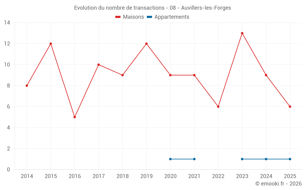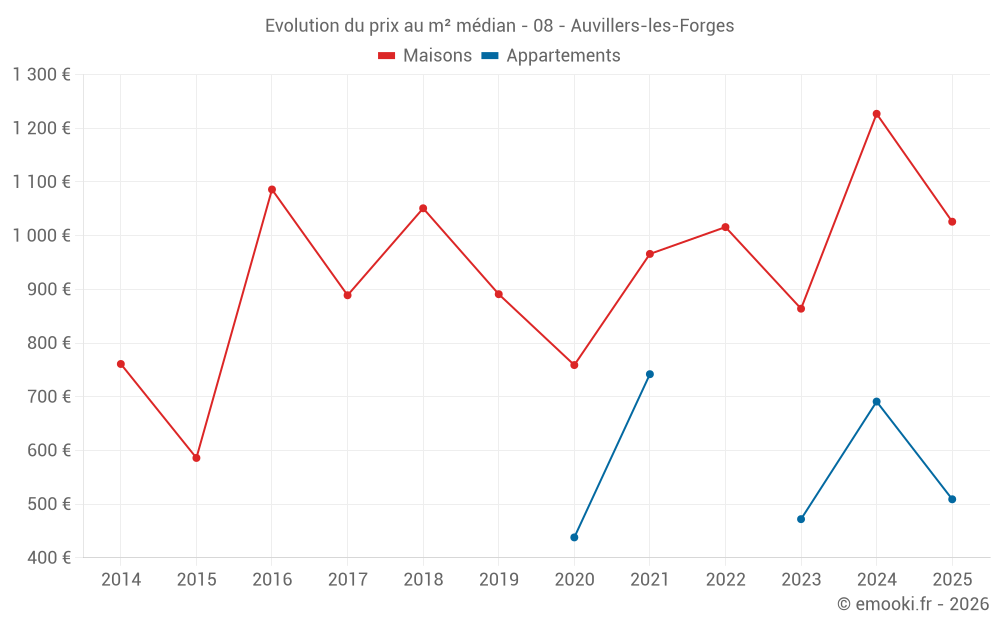 Le prix médian sur les 22 transactions de maisons des 24 derniers mois dans la commune d'Auvillers-les-Forges était de 1 062 € par mètre carré pour une valeur foncière médiane de 108 000 €. Sur cette période 60% des transactions se sont situées entre 568 et 1 456 € par mètre carré (du 2ème au 8ème déciles).