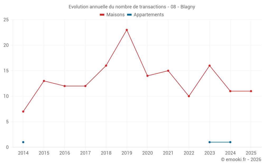Le prix médian sur les 18 transactions de maisons des 12 derniers mois dans la commune de Blagny était de 1 167 € par mètre carré pour une valeur foncière médiane de 95 000 €. Sur cette période 60% des transactions se sont situées entre 759 et 1 465 € par mètre carré (du 2ème au 8ème déciles).