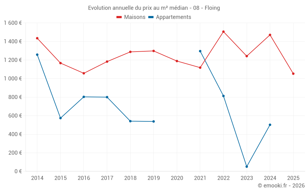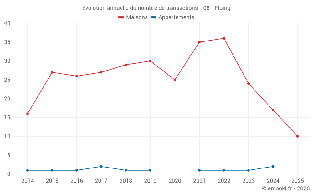 Le prix médian sur les 21 transactions de maisons des 12 derniers mois dans la commune de Floing était de 1 239 € par mètre carré pour une valeur foncière médiane de 125 000 €. Sur cette période 60% des transactions se sont situées entre 804 et 1 732 € par mètre carré (du 2ème au 8ème déciles).