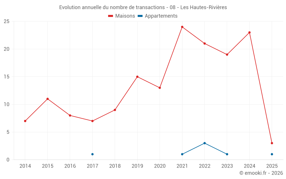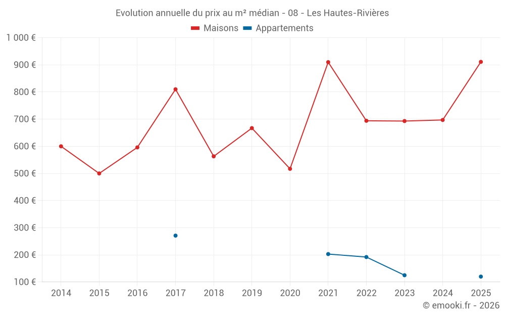 Le prix médian sur les 18 transactions de maisons des 12 derniers mois dans la commune des Hautes-Rivières était de 839 € par mètre carré pour une valeur foncière médiane de 68 000 €. Sur cette période 60% des transactions se sont situées entre 400 et 1 157 € par mètre carré (du 2ème au 8ème déciles).