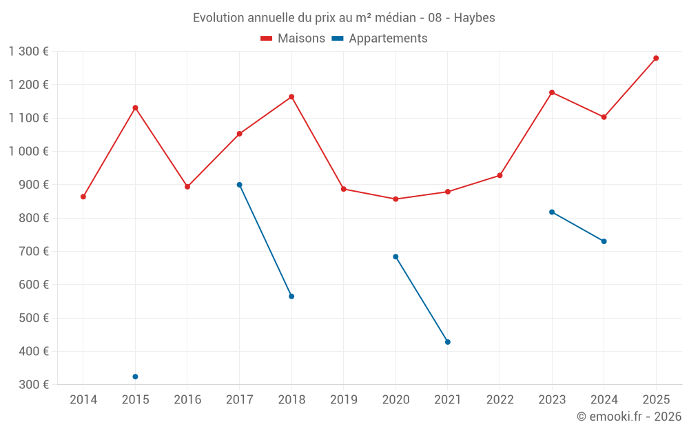 Le prix médian sur les 36 transactions de maisons des 24 derniers mois dans la commune de Haybes était de 1 107 € par mètre carré pour une valeur foncière médiane de 82 750 €. Sur cette période 60% des transactions se sont situées entre 623 et 1 686 € par mètre carré (du 2ème au 8ème déciles).