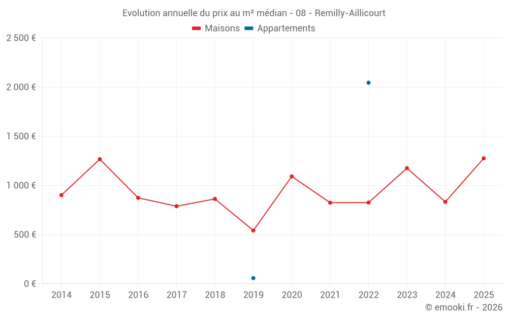 Le prix médian sur les 18 transactions de maisons des 24 derniers mois dans la commune de Remilly-Aillicourt était de 1 131 € par mètre carré pour une valeur foncière médiane de 108 390 €. Sur cette période 60% des transactions se sont situées entre 654 et 1 408 € par mètre carré (du 2ème au 8ème déciles).