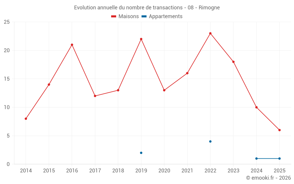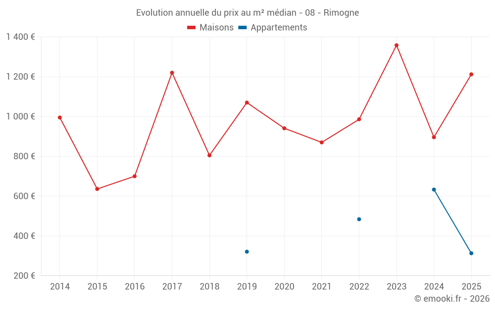 Le prix médian sur les 24 transactions de maisons des 24 derniers mois dans la commune de Rimogne était de 1 212 € par mètre carré pour une valeur foncière médiane de 133 500 €. Sur cette période 60% des transactions se sont situées entre 666 et 1 697 € par mètre carré (du 2ème au 8ème déciles).
