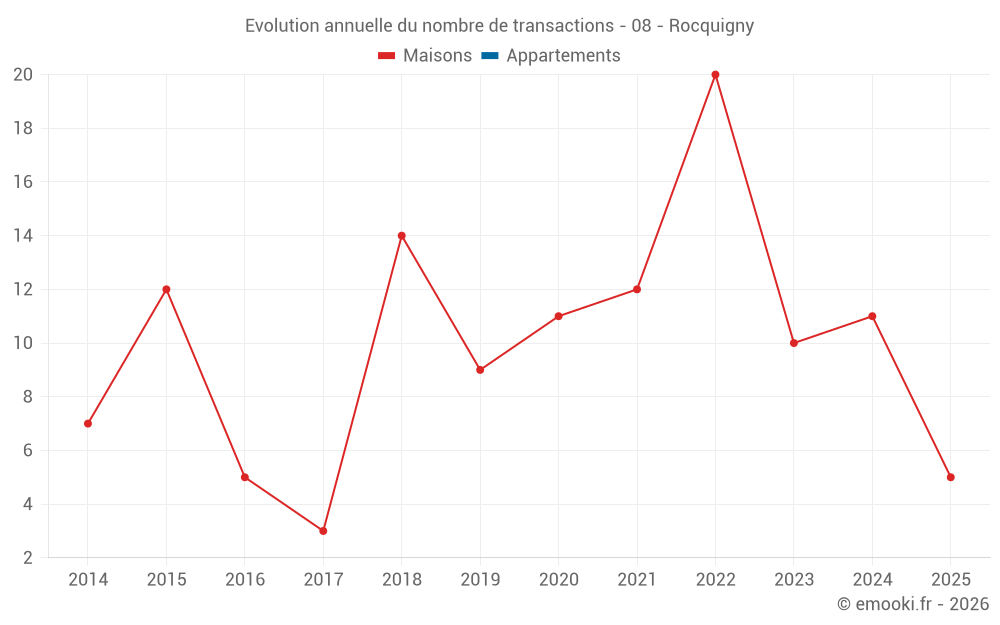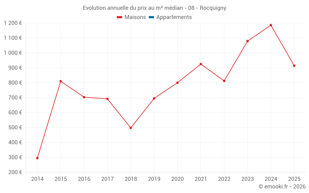 Le prix médian sur les 19 transactions de maisons des 24 derniers mois dans la commune de Rocquigny était de 1 186 € par mètre carré pour une valeur foncière médiane de 100 000 €. Sur cette période 60% des transactions se sont situées entre 578 et 1 548 € par mètre carré (du 2ème au 8ème déciles).