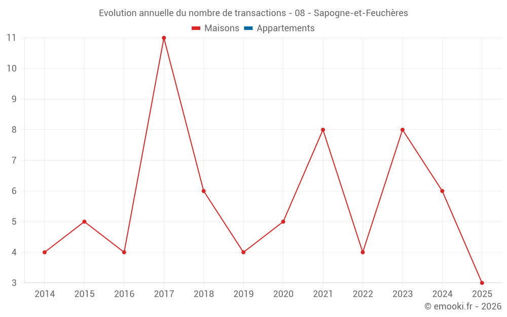 Le prix médian sur les 14 transactions de maisons des 24 derniers mois dans la commune de Sapogne-et-Feuchères était de 881 € par mètre carré pour une valeur foncière médiane de 105 000 €. Sur cette période 60% des transactions se sont situées entre 371 et 1 673 € par mètre carré (du 2ème au 8ème déciles).