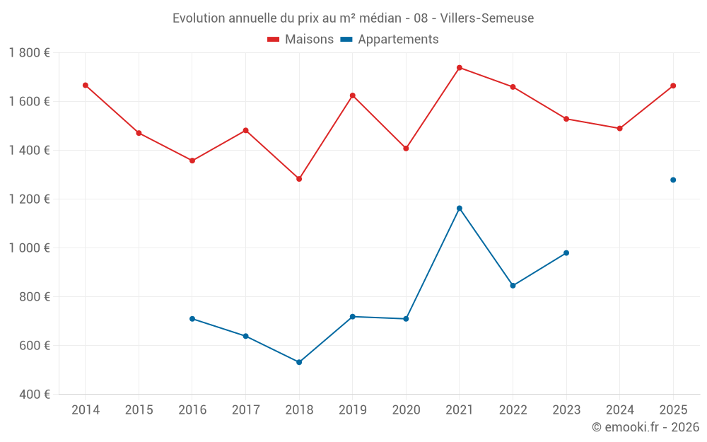Le prix médian sur les 25 transactions de maisons des 12 derniers mois dans la commune de Villers-Semeuse était de 1 684 € par mètre carré pour une valeur foncière médiane de 170 000 €. Sur cette période 60% des transactions se sont situées entre 1 278 et 1 900 € par mètre carré (du 2ème au 8ème déciles).