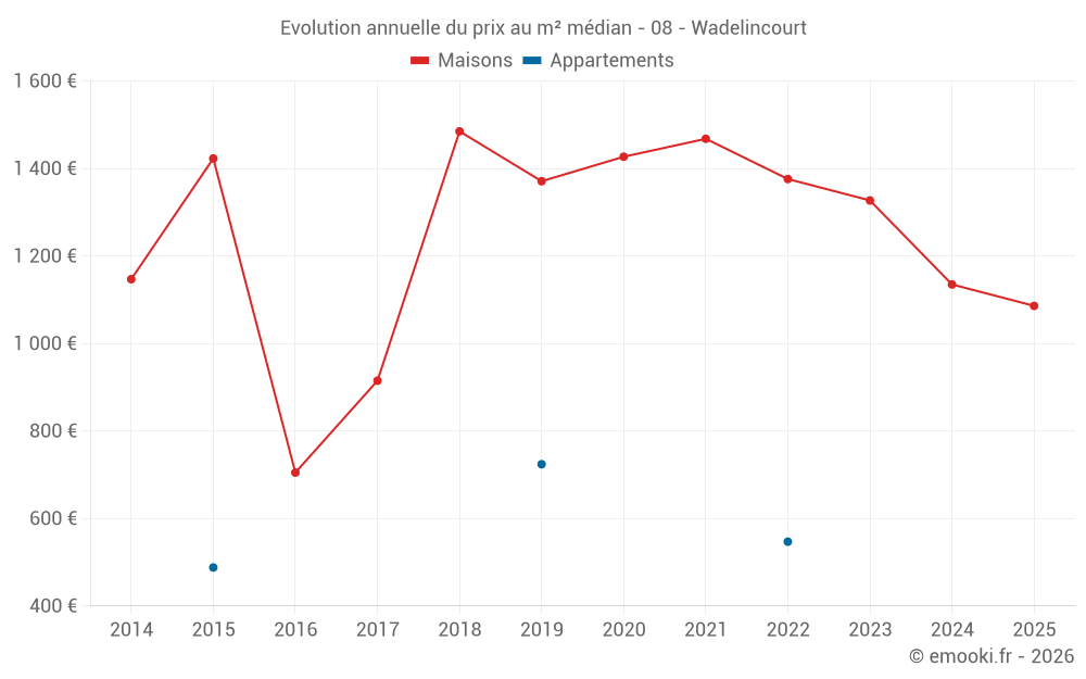 Le prix médian sur les 18 transactions de maisons des 24 derniers mois dans la commune de Wadelincourt était de 1 202 € par mètre carré pour une valeur foncière médiane de 120 000 €. Sur cette période 60% des transactions se sont situées entre 641 et 1 603 € par mètre carré (du 2ème au 8ème déciles).