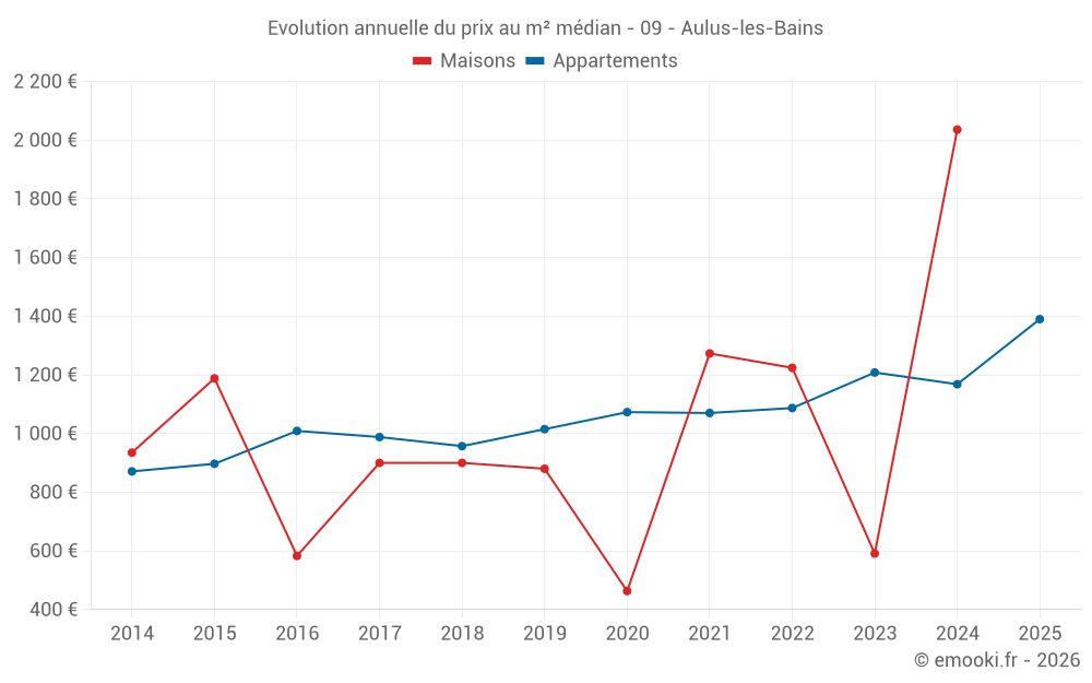 Le prix médian sur les 16 transactions d'appartements des 12 derniers mois dans la commune d'Aulus-les-Bains était de 1 164 € par mètre carré pour une valeur foncière médiane de 48 120 €. Sur cette période 60% des transactions se sont situées entre 1 041 et 1 344 € par mètre carré (du 2ème au 8ème déciles).