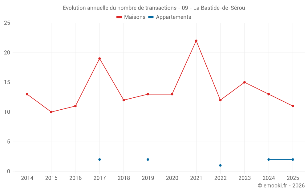 Le prix médian sur les 24 transactions de maisons des 24 derniers mois dans la commune de la Bastide-de-Sérou était de 1 274 € par mètre carré pour une valeur foncière médiane de 118 500 €. Sur cette période 60% des transactions se sont situées entre 589 et 1 816 € par mètre carré (du 2ème au 8ème déciles).