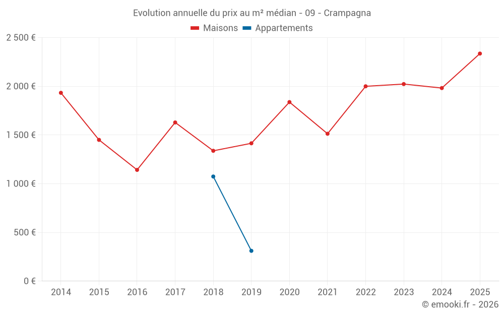 Le prix médian sur les 25 transactions de maisons des 24 derniers mois dans la commune de Crampagna était de 1 968 € par mètre carré pour une valeur foncière médiane de 213 000 €. Sur cette période 60% des transactions se sont situées entre 1 398 et 2 478 € par mètre carré (du 2ème au 8ème déciles).
