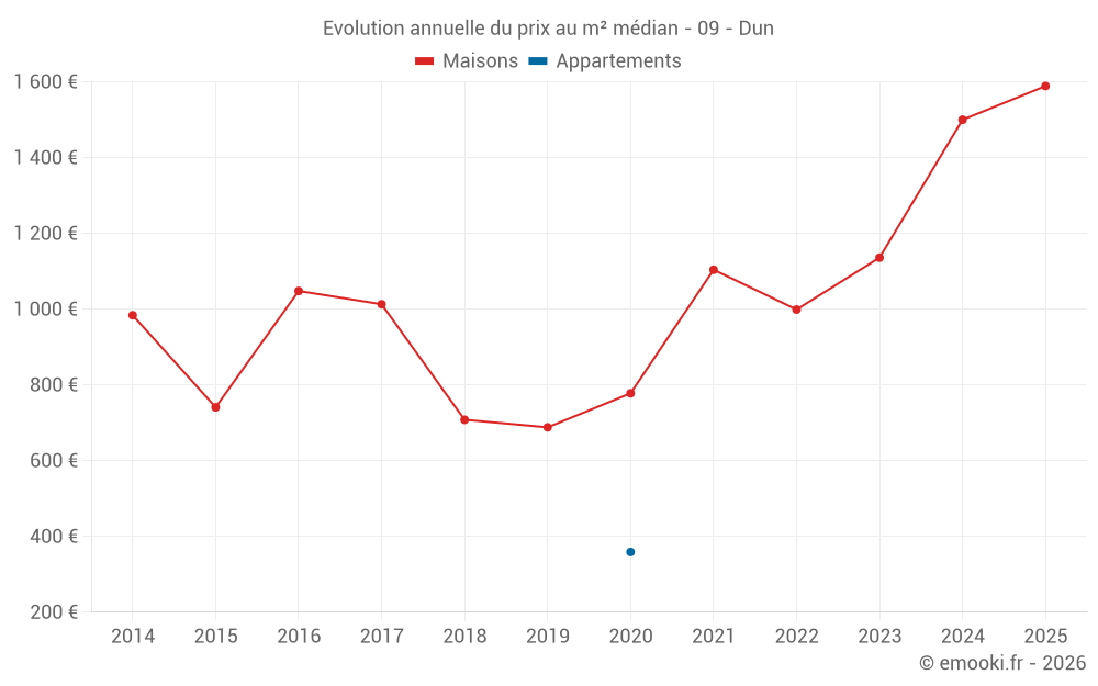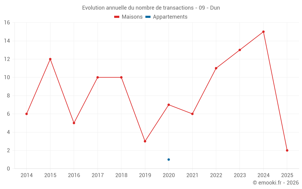Le prix médian sur les 25 transactions de maisons des 24 derniers mois dans la commune de Dun était de 1 438 € par mètre carré pour une valeur foncière médiane de 135 000 €. Sur cette période 60% des transactions se sont situées entre 787 et 1 934 € par mètre carré (du 2ème au 8ème déciles).