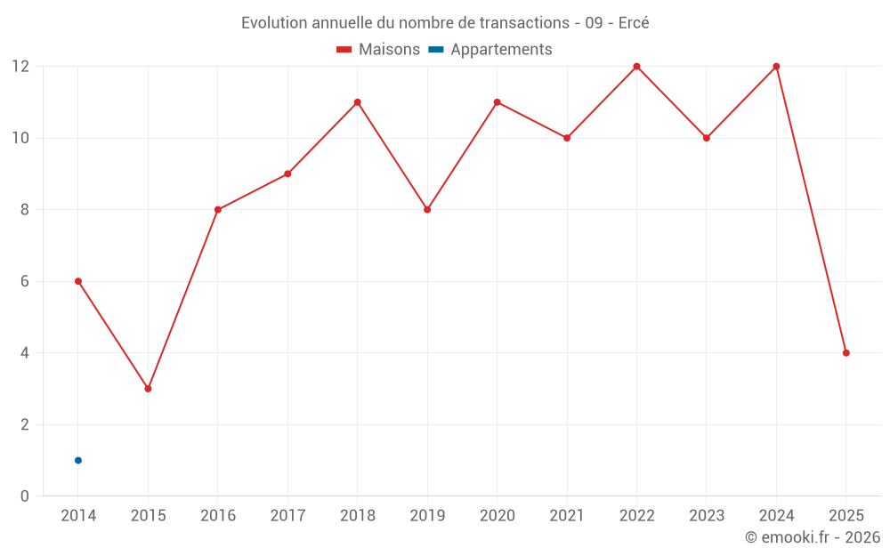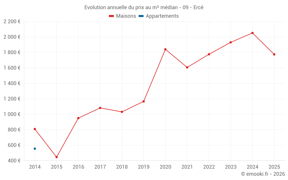Le prix médian sur les 22 transactions de maisons des 24 derniers mois dans la commune d'Ercé était de 1 959 € par mètre carré pour une valeur foncière médiane de 117 000 €. Sur cette période 60% des transactions se sont situées entre 1 365 et 2 817 € par mètre carré (du 2ème au 8ème déciles).