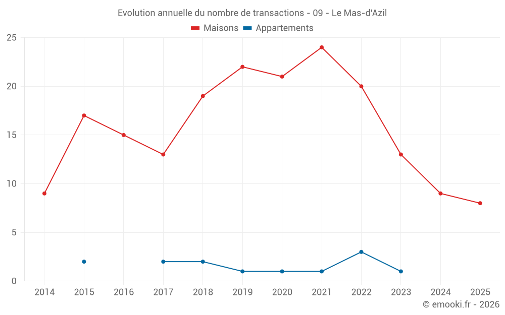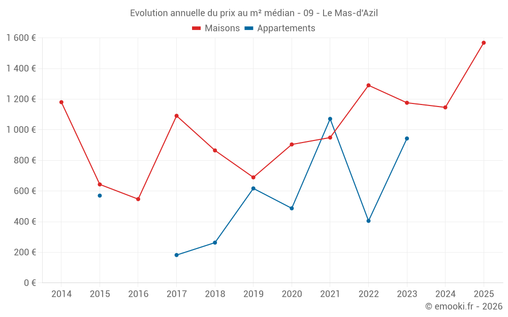 Le prix médian sur les 16 transactions de maisons des 12 derniers mois dans la commune du Mas-d'Azil était de 1 428 € par mètre carré pour une valeur foncière médiane de 127 500 €. Sur cette période 60% des transactions se sont situées entre 692 et 2 271 € par mètre carré (du 2ème au 8ème déciles).