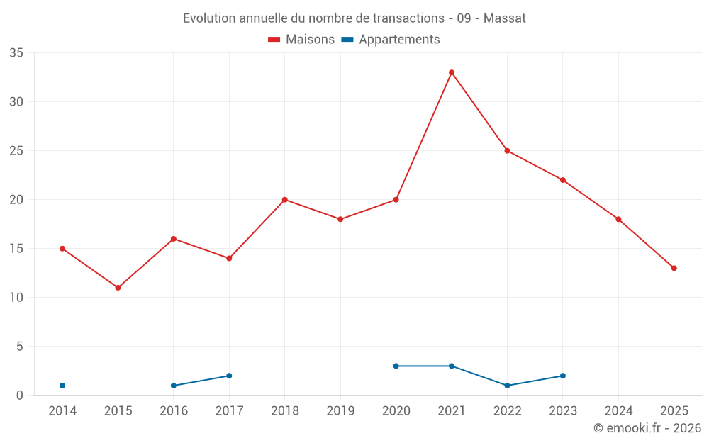 Le prix médian sur les 24 transactions de maisons des 12 derniers mois dans la commune de Massat était de 1 110 € par mètre carré pour une valeur foncière médiane de 64 900 €. Sur cette période 60% des transactions se sont situées entre 516 et 1 899 € par mètre carré (du 2ème au 8ème déciles).