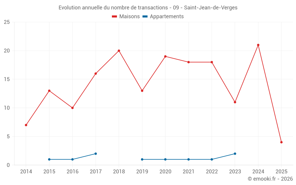 Le prix médian sur les 31 transactions de maisons des 24 derniers mois dans la commune de Saint-Jean-de-Verges était de 1 729 € par mètre carré pour une valeur foncière médiane de 170 000 €. Sur cette période 60% des transactions se sont situées entre 1 157 et 2 368 € par mètre carré (du 2ème au 8ème déciles).