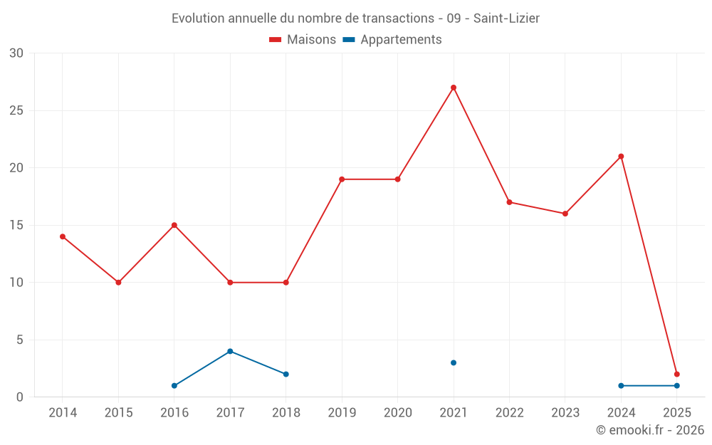 Le prix médian sur les 17 transactions de maisons des 12 derniers mois dans la commune de Saint-Lizier était de 1 370 € par mètre carré pour une valeur foncière médiane de 150 000 €. Sur cette période 60% des transactions se sont situées entre 710 et 1 860 € par mètre carré (du 2ème au 8ème déciles).
