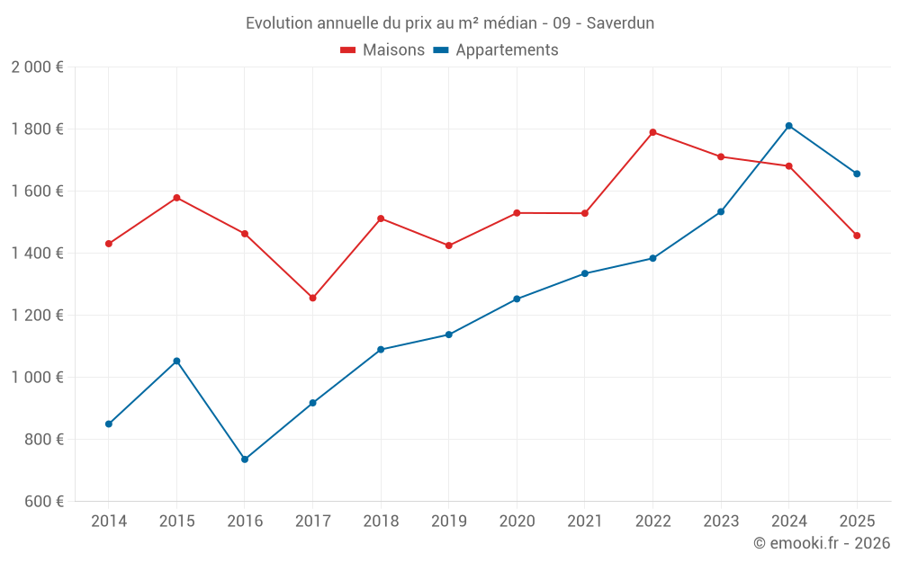 Le prix médian sur les 40 transactions de maisons des 12 derniers mois dans la commune de Saverdun était de 1 574 € par mètre carré pour une valeur foncière médiane de 163 000 €. Sur cette période 60% des transactions se sont situées entre 1 097 et 2 018 € par mètre carré (du 2ème au 8ème déciles).