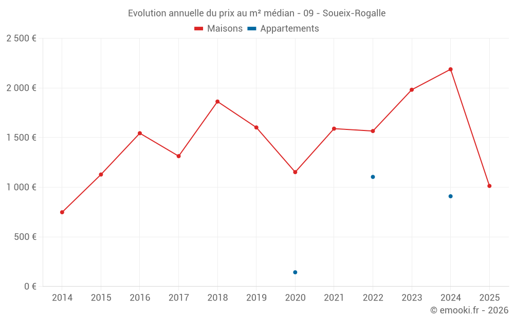 Le prix médian sur les 14 transactions de maisons des 24 derniers mois dans la commune de Soueix-Rogalle était de 1 618 € par mètre carré pour une valeur foncière médiane de 128 185 €. Sur cette période 60% des transactions se sont situées entre 971 et 2 900 € par mètre carré (du 2ème au 8ème déciles).