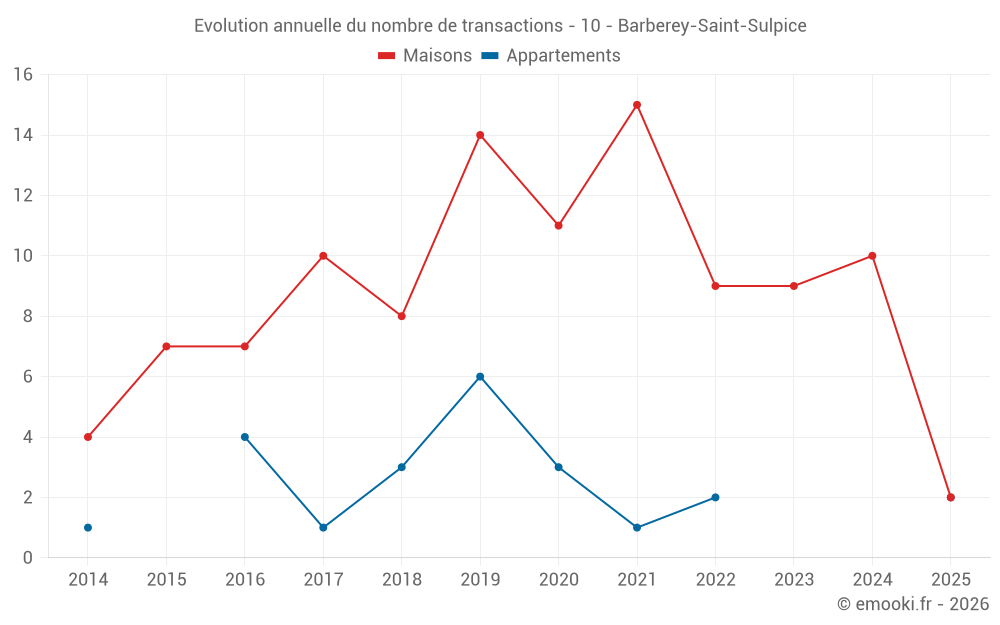 Le prix médian sur les 14 transactions de maisons des 24 derniers mois dans la commune de Barberey-Saint-Sulpice était de 1 903 € par mètre carré pour une valeur foncière médiane de 208 362 €. Sur cette période 60% des transactions se sont situées entre 1 685 et 2 660 € par mètre carré (du 2ème au 8ème déciles).