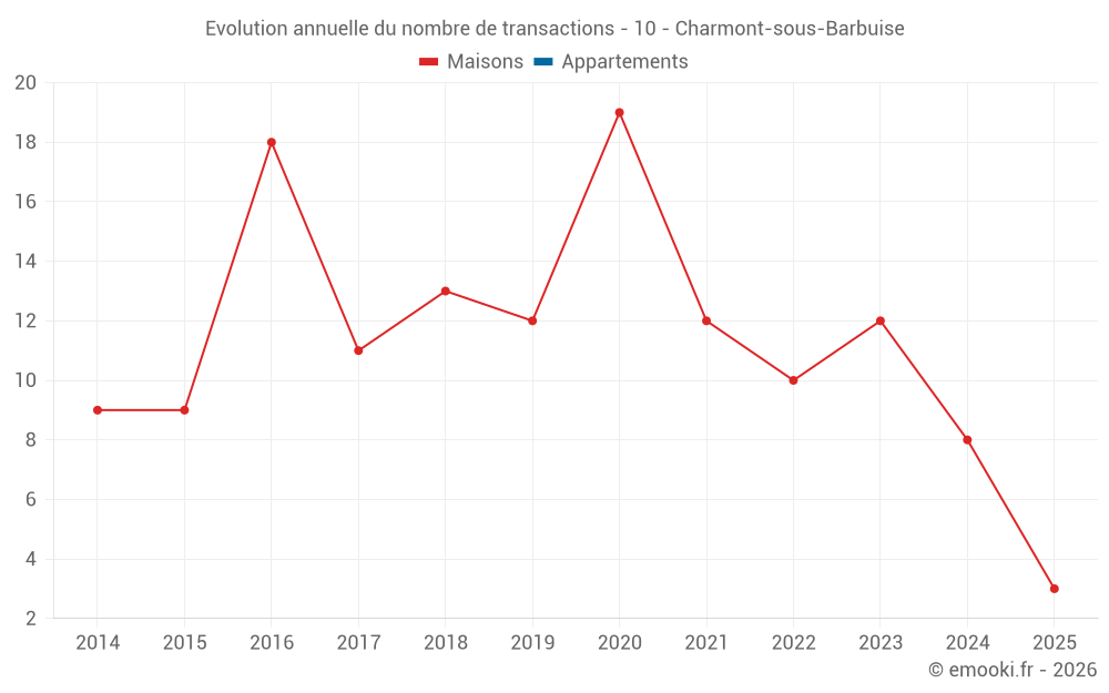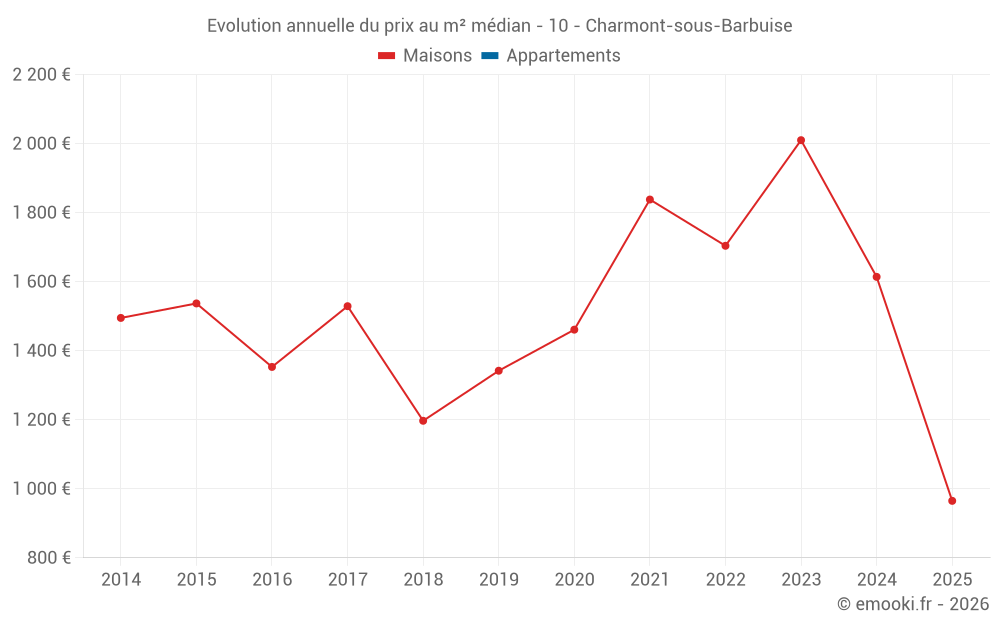 Le prix médian sur les 18 transactions de maisons des 24 derniers mois dans la commune de Charmont-sous-Barbuise était de 1 614 € par mètre carré pour une valeur foncière médiane de 223 000 €. Sur cette période 60% des transactions se sont situées entre 1 053 et 2 056 € par mètre carré (du 2ème au 8ème déciles).