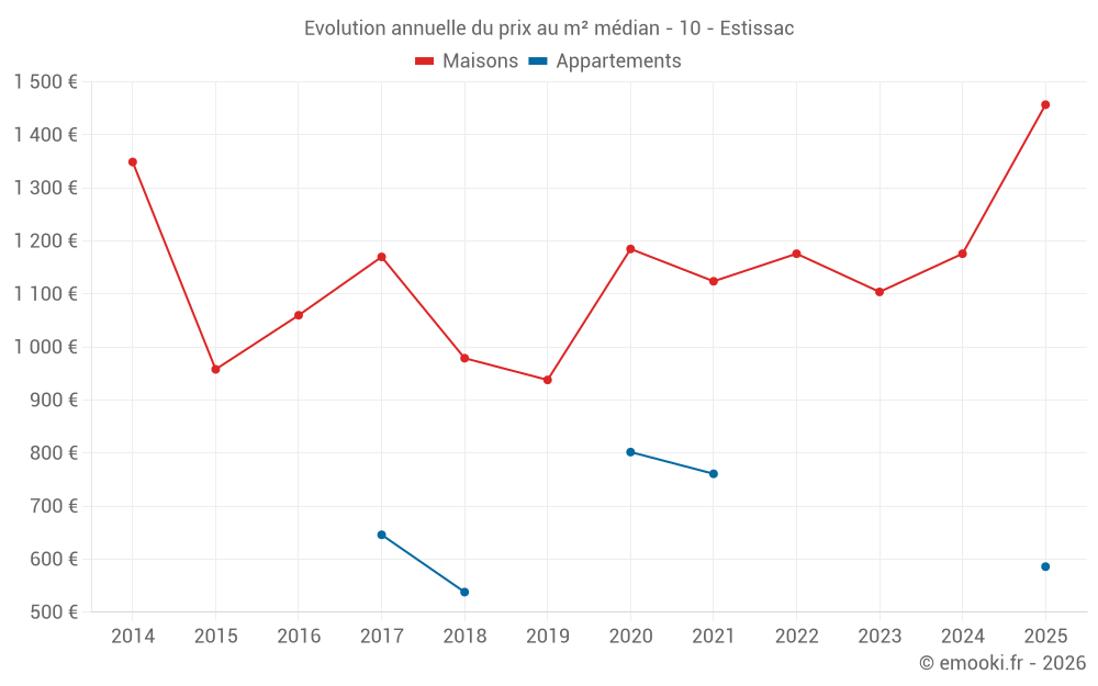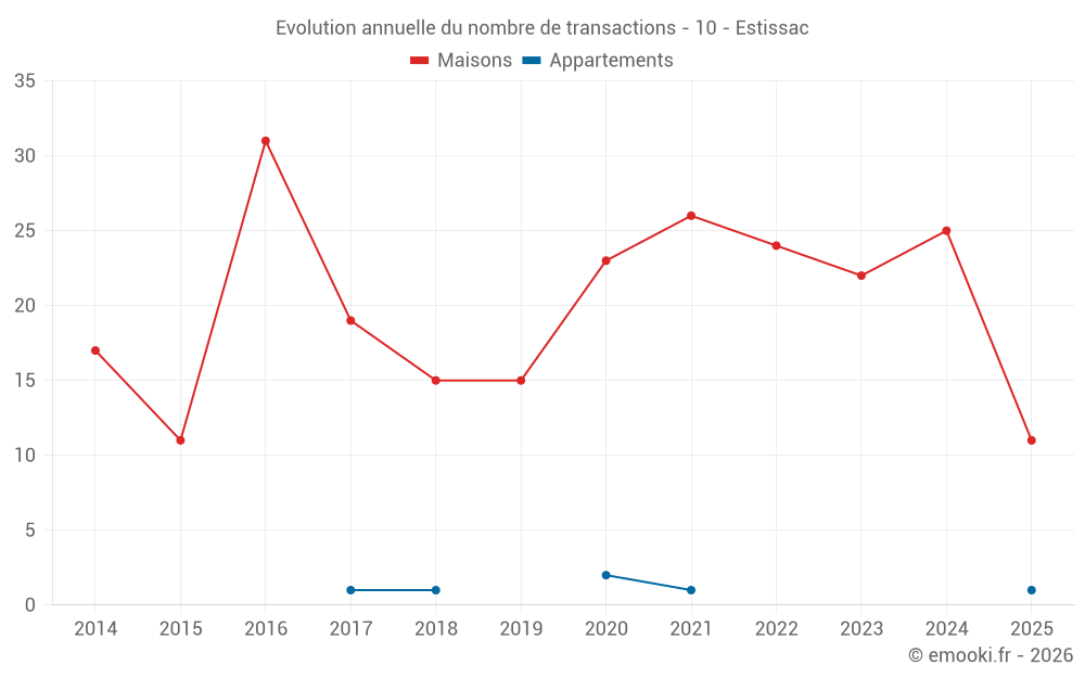 Le prix médian sur les 28 transactions de maisons des 12 derniers mois dans la commune d'Estissac était de 1 288 € par mètre carré pour une valeur foncière médiane de 112 500 €. Sur cette période 60% des transactions se sont situées entre 893 et 1 657 € par mètre carré (du 2ème au 8ème déciles).