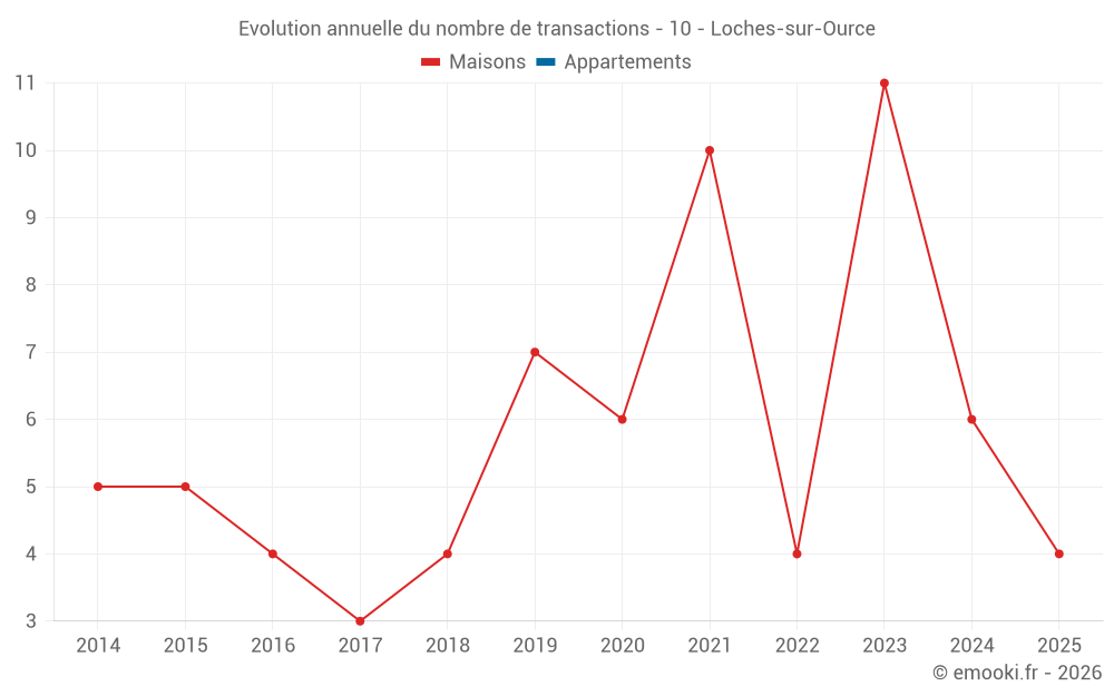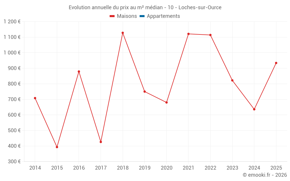 Le prix médian sur les 18 transactions de maisons des 24 derniers mois dans la commune de Loches-sur-Ource était de 732 € par mètre carré pour une valeur foncière médiane de 63 000 €. Sur cette période 60% des transactions se sont situées entre 371 et 1 069 € par mètre carré (du 2ème au 8ème déciles).