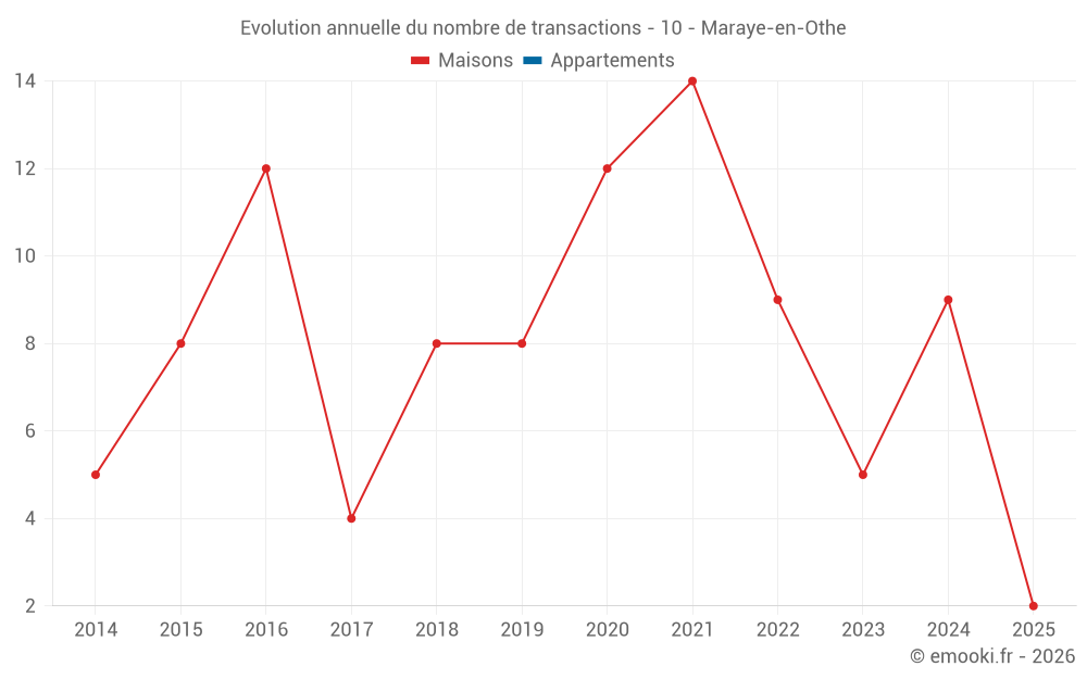 Le prix médian sur les 16 transactions de maisons des 24 derniers mois dans la commune de Maraye-en-Othe était de 1 280 € par mètre carré pour une valeur foncière médiane de 162 000 €. Sur cette période 60% des transactions se sont situées entre 671 et 1 618 € par mètre carré (du 2ème au 8ème déciles).