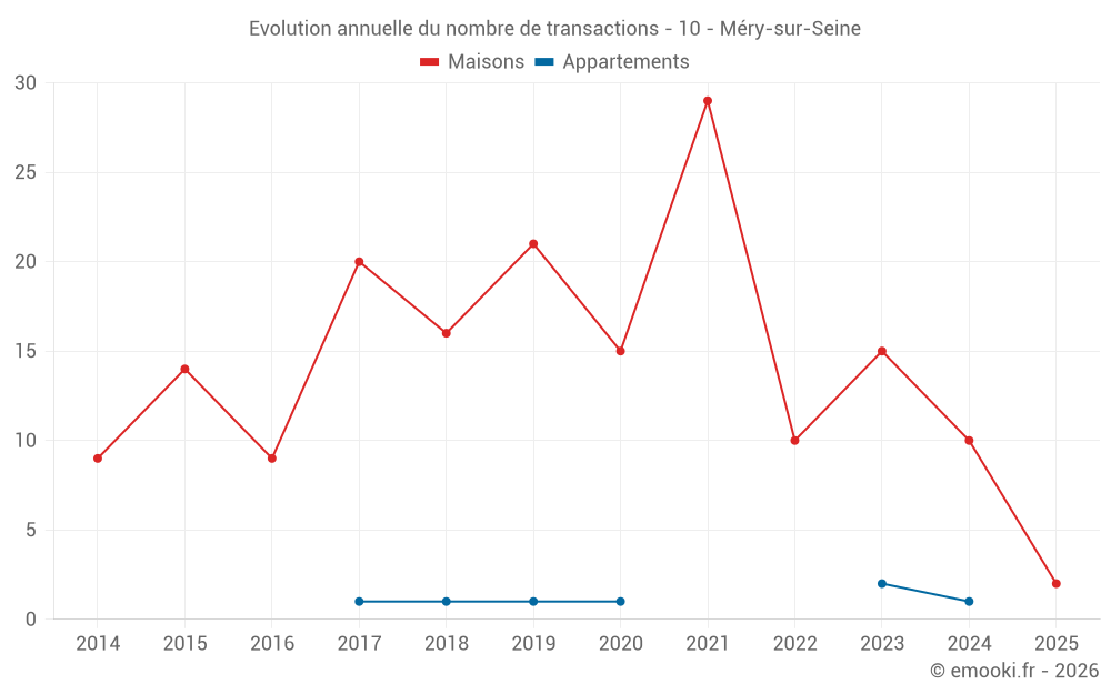 Le prix médian sur les 23 transactions de maisons des 24 derniers mois dans la commune de Méry-sur-Seine était de 1 357 € par mètre carré pour une valeur foncière médiane de 115 000 €. Sur cette période 60% des transactions se sont situées entre 948 et 1 743 € par mètre carré (du 2ème au 8ème déciles).