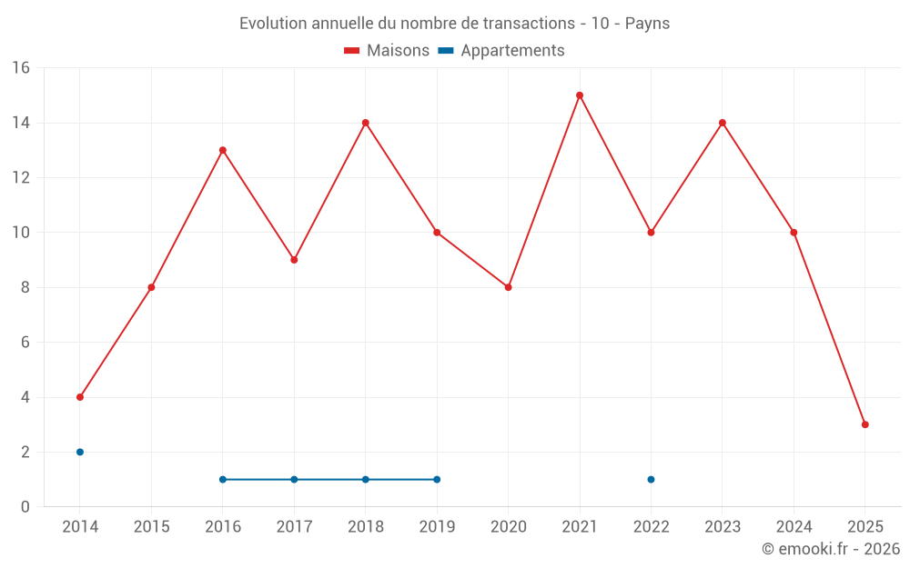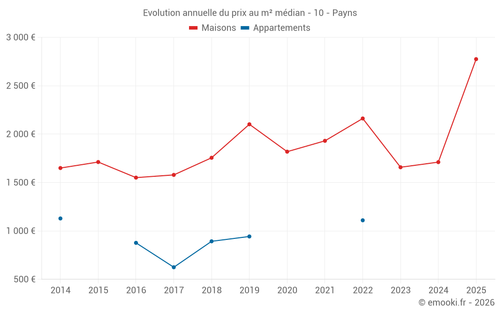 Le prix médian sur les 20 transactions de maisons des 24 derniers mois dans la commune de Payns était de 1 789 € par mètre carré pour une valeur foncière médiane de 194 500 €. Sur cette période 60% des transactions se sont situées entre 1 495 et 2 207 € par mètre carré (du 2ème au 8ème déciles).