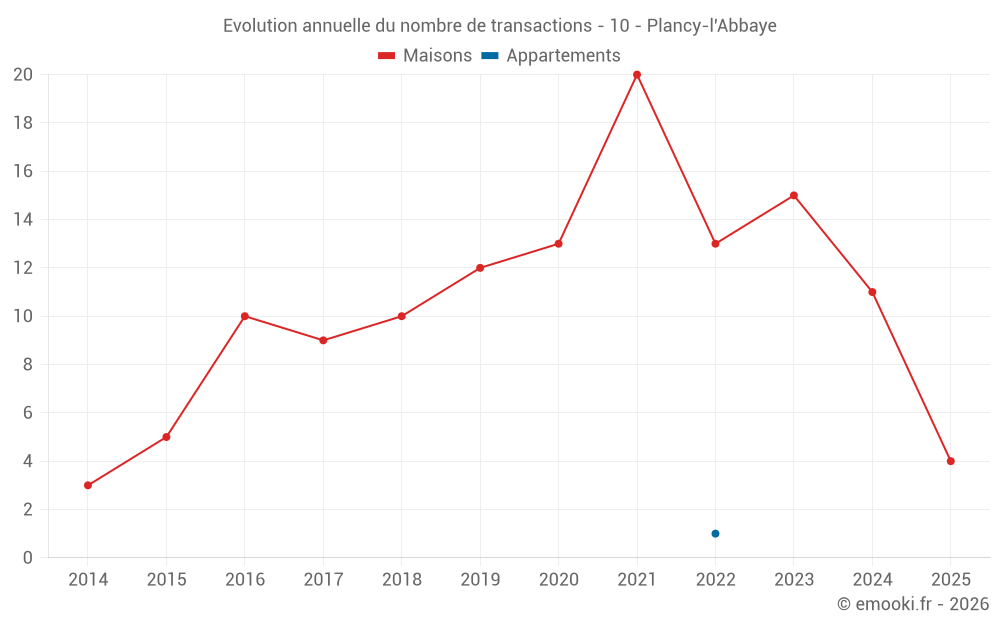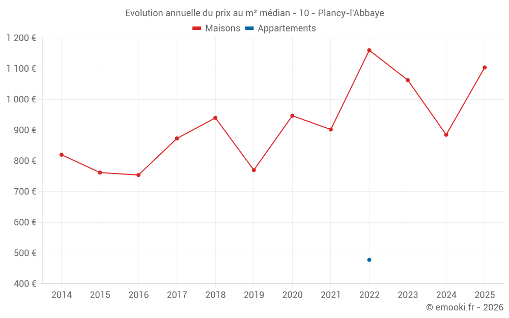 Le prix médian sur les 23 transactions de maisons des 24 derniers mois dans la commune de Plancy-l'Abbaye était de 1 063 € par mètre carré pour une valeur foncière médiane de 120 000 €. Sur cette période 60% des transactions se sont situées entre 679 et 1 377 € par mètre carré (du 2ème au 8ème déciles).