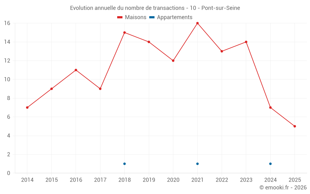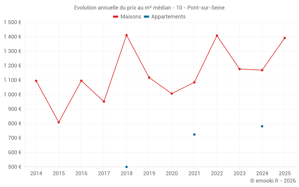 Le prix médian sur les 20 transactions de maisons des 24 derniers mois dans la commune de Pont-sur-Seine était de 1 247 € par mètre carré pour une valeur foncière médiane de 123 250 €. Sur cette période 60% des transactions se sont situées entre 756 et 1 577 € par mètre carré (du 2ème au 8ème déciles).