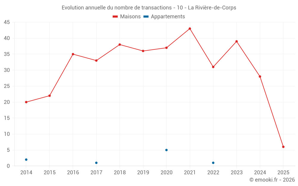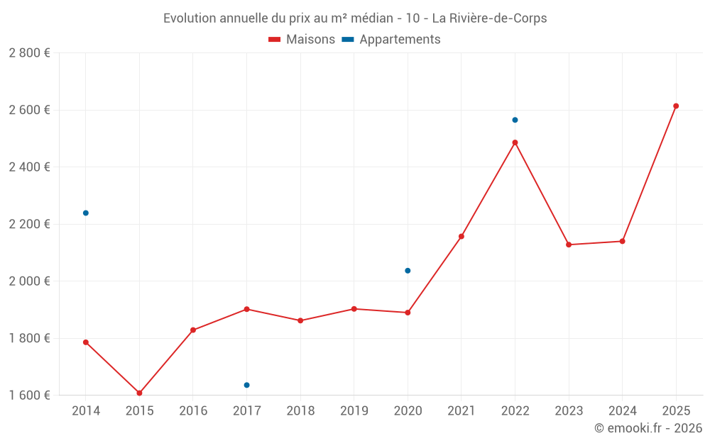 Le prix médian sur les 27 transactions de maisons des 12 derniers mois dans la commune de la Rivière-de-Corps était de 2 188 € par mètre carré pour une valeur foncière médiane de 210 000 €. Sur cette période 60% des transactions se sont situées entre 1 856 et 2 603 € par mètre carré (du 2ème au 8ème déciles).