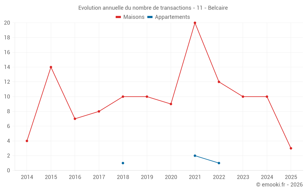Le prix médian sur les 18 transactions de maisons des 24 derniers mois dans la commune de Belcaire était de 1 143 € par mètre carré pour une valeur foncière médiane de 96 000 €. Sur cette période 60% des transactions se sont situées entre 484 et 2 024 € par mètre carré (du 2ème au 8ème déciles).