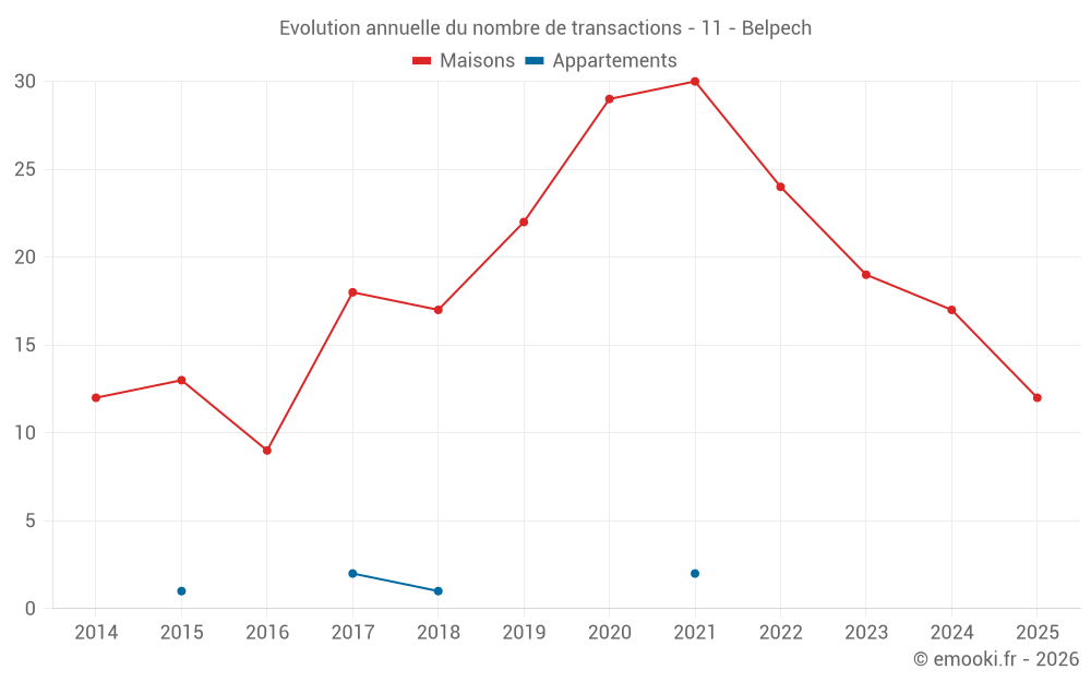 Le prix médian sur les 20 transactions de maisons des 12 derniers mois dans la commune de Belpech était de 1 432 € par mètre carré pour une valeur foncière médiane de 115 414 €. Sur cette période 60% des transactions se sont situées entre 483 et 2 103 € par mètre carré (du 2ème au 8ème déciles).