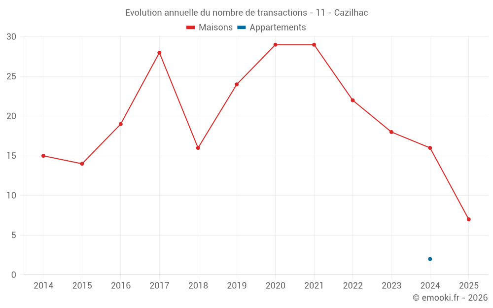 Le prix médian sur les 19 transactions de maisons des 12 derniers mois dans la commune de Cazilhac était de 1 909 € par mètre carré pour une valeur foncière médiane de 189 000 €. Sur cette période 60% des transactions se sont situées entre 1 691 et 2 445 € par mètre carré (du 2ème au 8ème déciles).