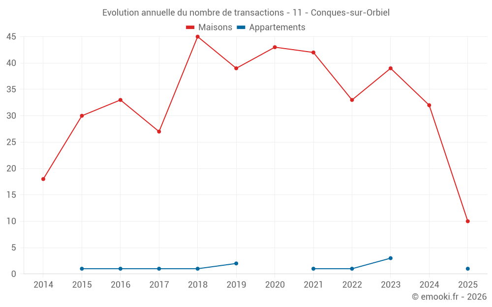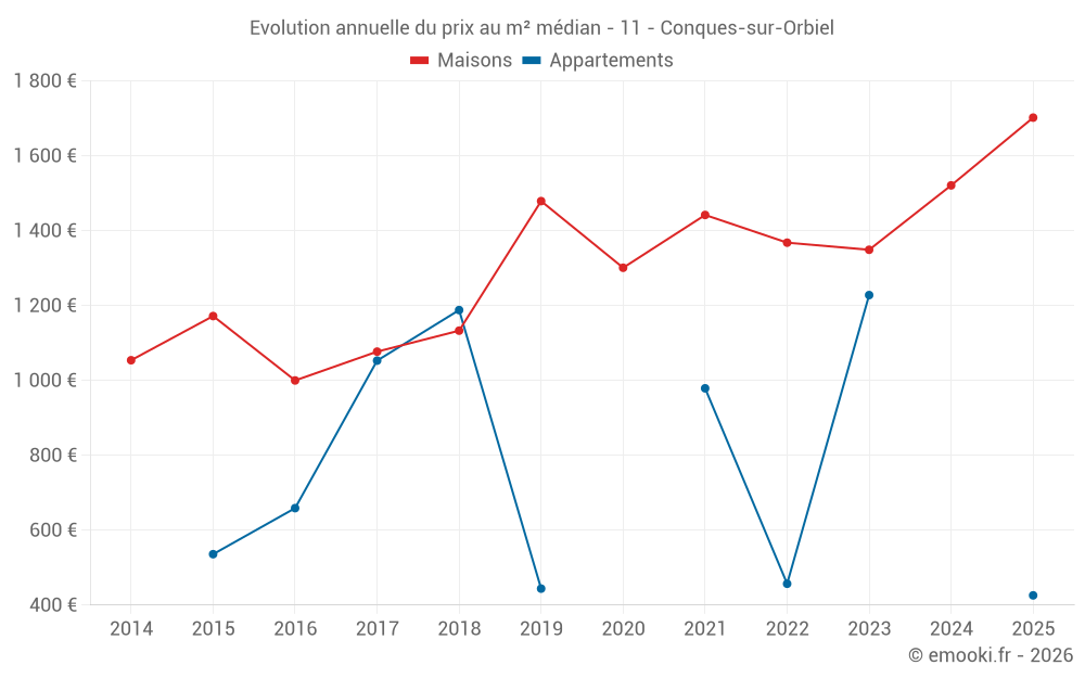 Le prix médian sur les 28 transactions de maisons des 12 derniers mois dans la commune de Conques-sur-Orbiel était de 1 684 € par mètre carré pour une valeur foncière médiane de 150 050 €. Sur cette période 60% des transactions se sont situées entre 988 et 2 325 € par mètre carré (du 2ème au 8ème déciles).