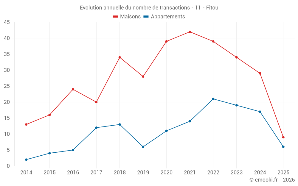Le prix médian sur les 25 transactions de maisons des 12 derniers mois dans la commune de Fitou était de 2 192 € par mètre carré pour une valeur foncière médiane de 131 000 €. Sur cette période 60% des transactions se sont situées entre 1 057 et 2 689 € par mètre carré (du 2ème au 8ème déciles).