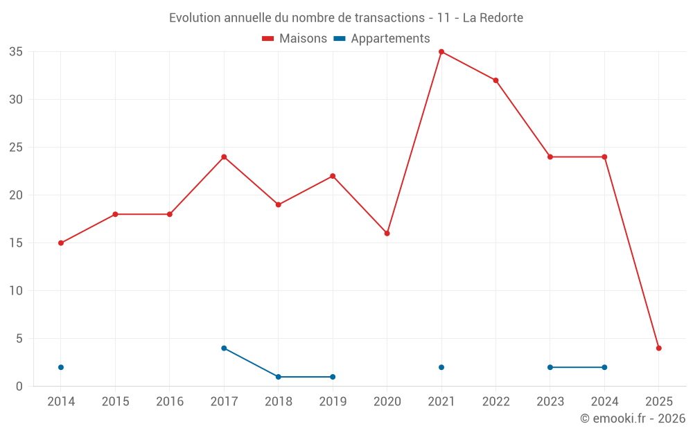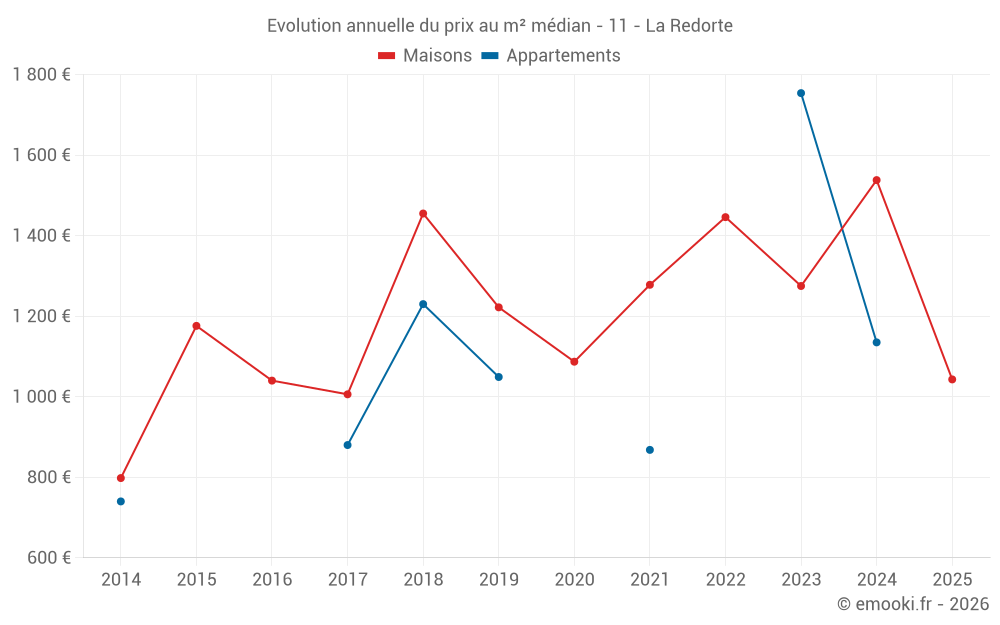 Le prix médian sur les 16 transactions de maisons des 12 derniers mois dans la commune de la Redorte était de 1 120 € par mètre carré pour une valeur foncière médiane de 102 000 €. Sur cette période 60% des transactions se sont situées entre 634 et 1 604 € par mètre carré (du 2ème au 8ème déciles).