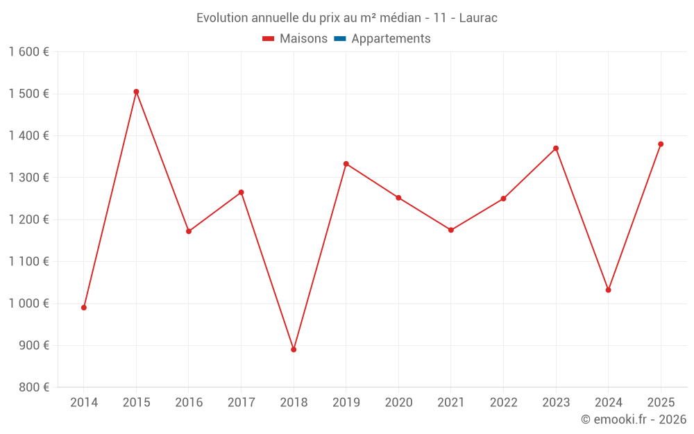 Le prix médian sur les 16 transactions de maisons des 24 derniers mois dans la commune de Laurac était de 1 237 € par mètre carré pour une valeur foncière médiane de 110 400 €. Sur cette période 60% des transactions se sont situées entre 901 et 1 495 € par mètre carré (du 2ème au 8ème déciles).