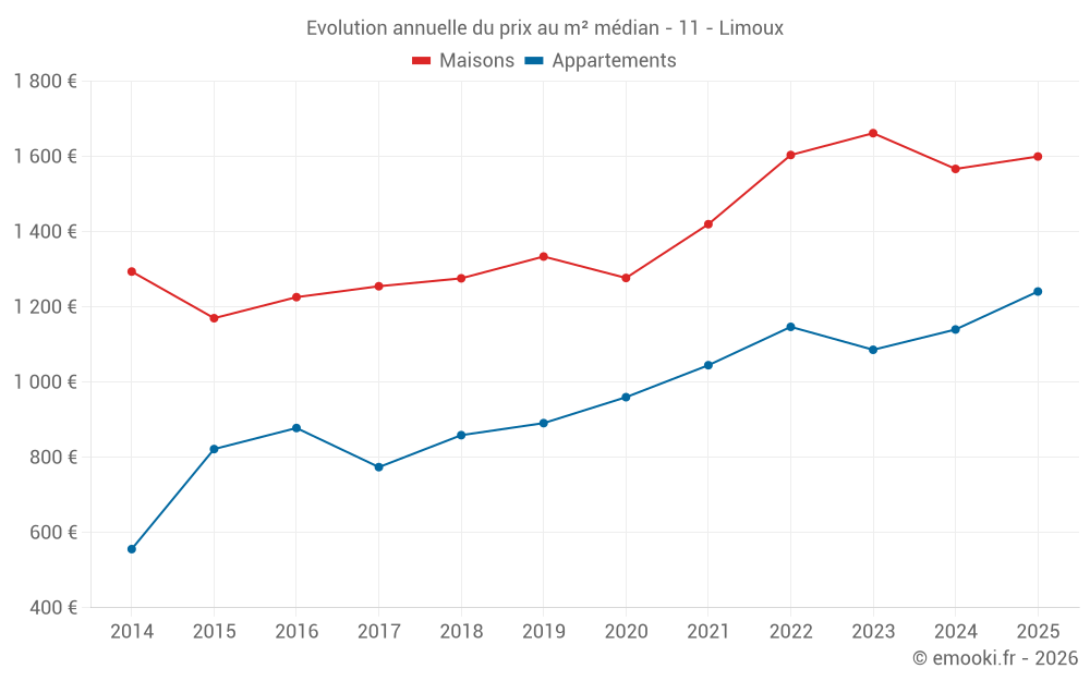 Le prix médian sur les 18 transactions d'appartements des 6 derniers mois dans la commune de Limoux était de 1 241 € par mètre carré pour une valeur foncière médiane de 106 348 €. Sur cette période 60% des transactions se sont situées entre 847 et 1 647 € par mètre carré (du 2ème au 8ème déciles).