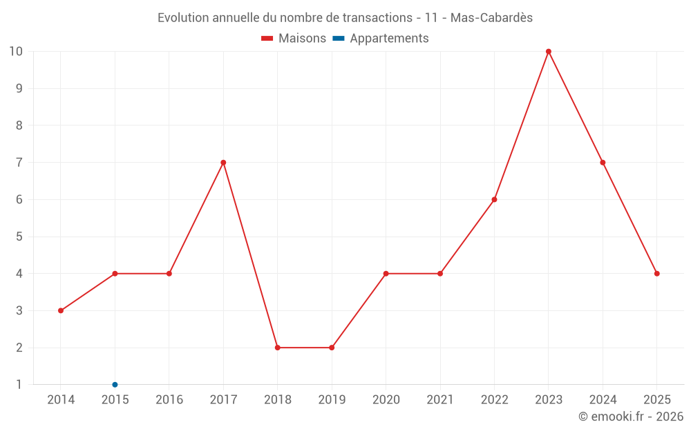 Le prix médian sur les 15 transactions de maisons des 24 derniers mois dans la commune de Mas-Cabardès était de 786 € par mètre carré pour une valeur foncière médiane de 45 000 €. Sur cette période 60% des transactions se sont situées entre 450 et 1 358 € par mètre carré (du 2ème au 8ème déciles).