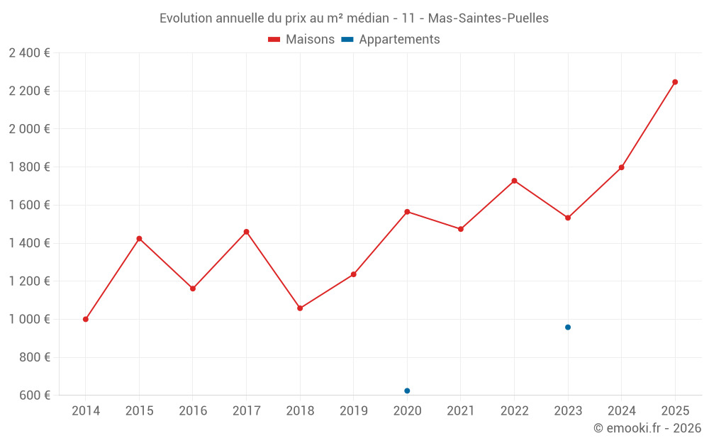 Le prix médian sur les 18 transactions de maisons des 24 derniers mois dans la commune de Mas-Saintes-Puelles était de 1 690 € par mètre carré pour une valeur foncière médiane de 158 850 €. Sur cette période 60% des transactions se sont situées entre 1 387 et 2 475 € par mètre carré (du 2ème au 8ème déciles).