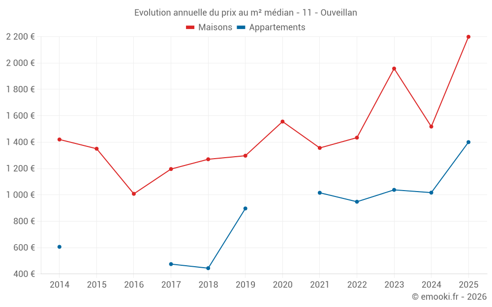 Le prix médian sur les 37 transactions de maisons des 12 derniers mois dans la commune d'Ouveillan était de 1 683 € par mètre carré pour une valeur foncière médiane de 152 000 €. Sur cette période 60% des transactions se sont situées entre 1 027 et 2 509 € par mètre carré (du 2ème au 8ème déciles).