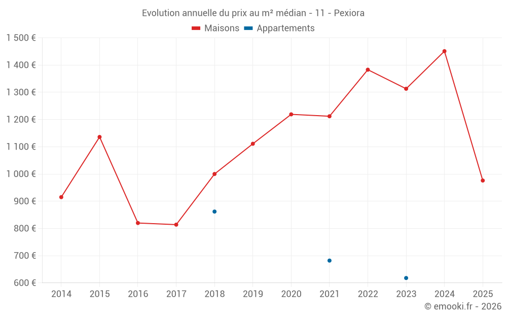 Le prix médian sur les 31 transactions de maisons des 24 derniers mois dans la commune de Pexiora était de 1 192 € par mètre carré pour une valeur foncière médiane de 102 300 €. Sur cette période 60% des transactions se sont situées entre 818 et 1 958 € par mètre carré (du 2ème au 8ème déciles).
